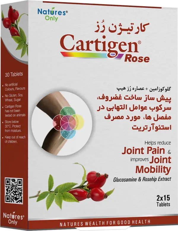 قرص Cartigen Rose از برند معتبر نیچرز اونلی، مکملی تخصصی برای سلامت مفاصل است که با ترکیب مؤثر رز هیپ (Rosehip)، MSM، گلوکزامین و ویتامین C، به کاهش التهاب، بهبود حرکت مفصلی، تقویت غضروفها و کاهش دردهای ناشی از آرتروز کمک میکند. این محصول مناسب برای افراد مبتلا به دردهای مفصلی، ورزشکاران و سالمندان است.