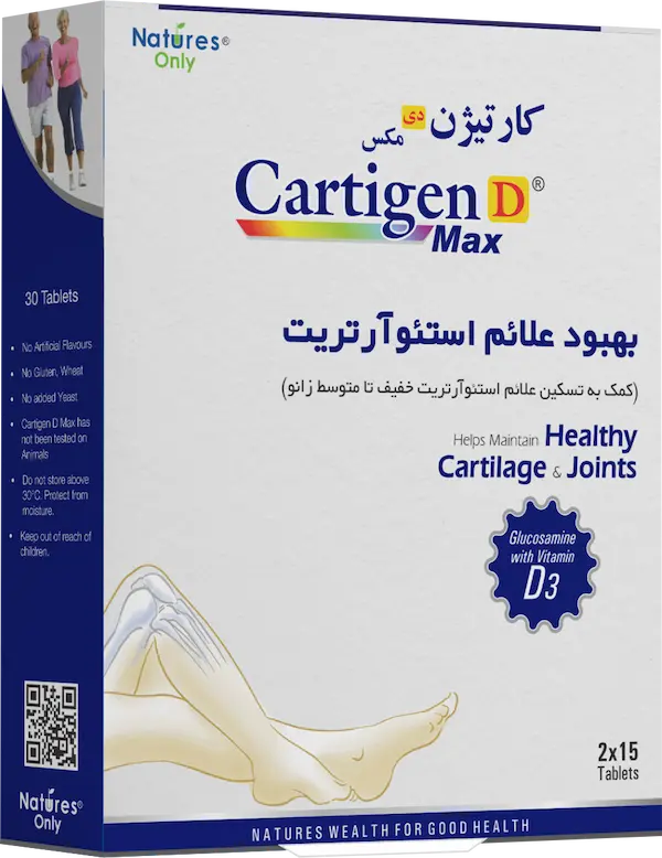 قرص Cartigen D Max از برند معتبر نیچرز اونلی، مکملی تخصصی برای سلامت مفاصل و استخوانهاست. این محصول با ترکیب مؤثر گلوکزامین، کندرویتین، MSM، ویتامین D3 و کلسیم، به کاهش التهاب، تقویت غضروفها، بهبود حرکت مفصلی و پیشگیری از تحلیل بافت مفصلی کمک میکند. مناسب برای افراد مبتلا به آرتروز، ورزشکاران و سالمندان.