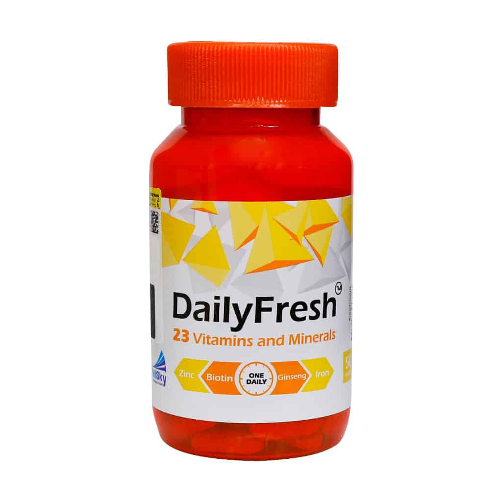 قرص دیلی فرش ویت اسکای – ۵۰ عددی یک مولتی‌ویتامین کامل حاوی ۲۳ نوع ویتامین و مینرال است که برای تقویت سلامت عمومی، افزایش انرژی، بهبود عملکرد سیستم ایمنی و کاهش خستگی روزانه طراحی شده است